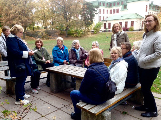 15 aktiva lyssnade på Aimes historia om de fina byggnaderna inom gamla o nya Långbro, fd mentalsjukusområde.