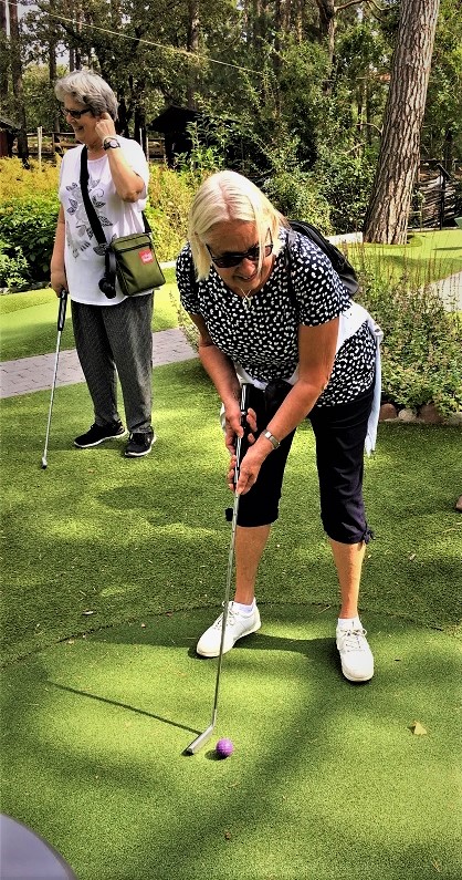 ”OJ vad det är roligt att spela bangolf med aktiva seniorer”! Tredje spelet är nu avklarat och det är osäkert om det blir ett fjärde spel den här sommaren. Vi blev nio aktiva på Aspuddens minigolfbana i vacker parkmiljö, fint väder och härlig stämning! Banan var lättspelad och alla gjorde bra ifrån sig, det blev ungefär lika resultat för alla och några gjorde hole-in-one och fick applåder för det! Alla är överens om att fortsätta nästa sommar, tack Lena för dagens arrangemang!