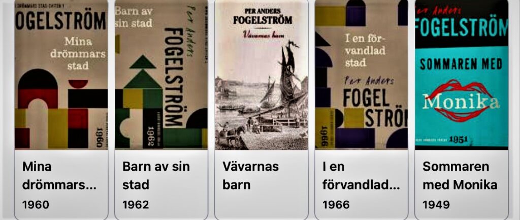 P O Fogelström har skrivit 40-tal böcker varav de flesta är Stockholmsskildringar. Mest känd är serien om Henning o Lotten, de fem böckerna i Stockolmsserien ”Mina drömmars stad” och barnseriens fem böcker om ”Vävarnas barn”.