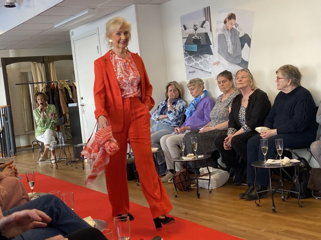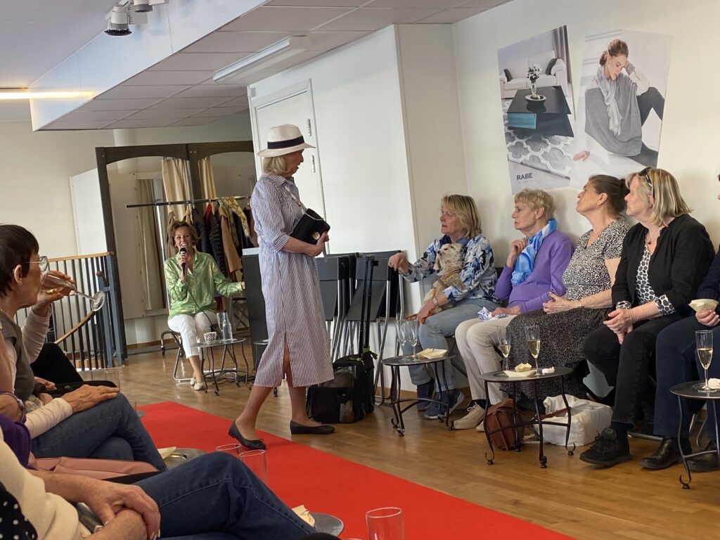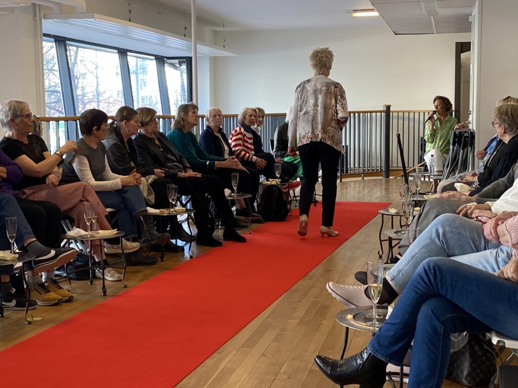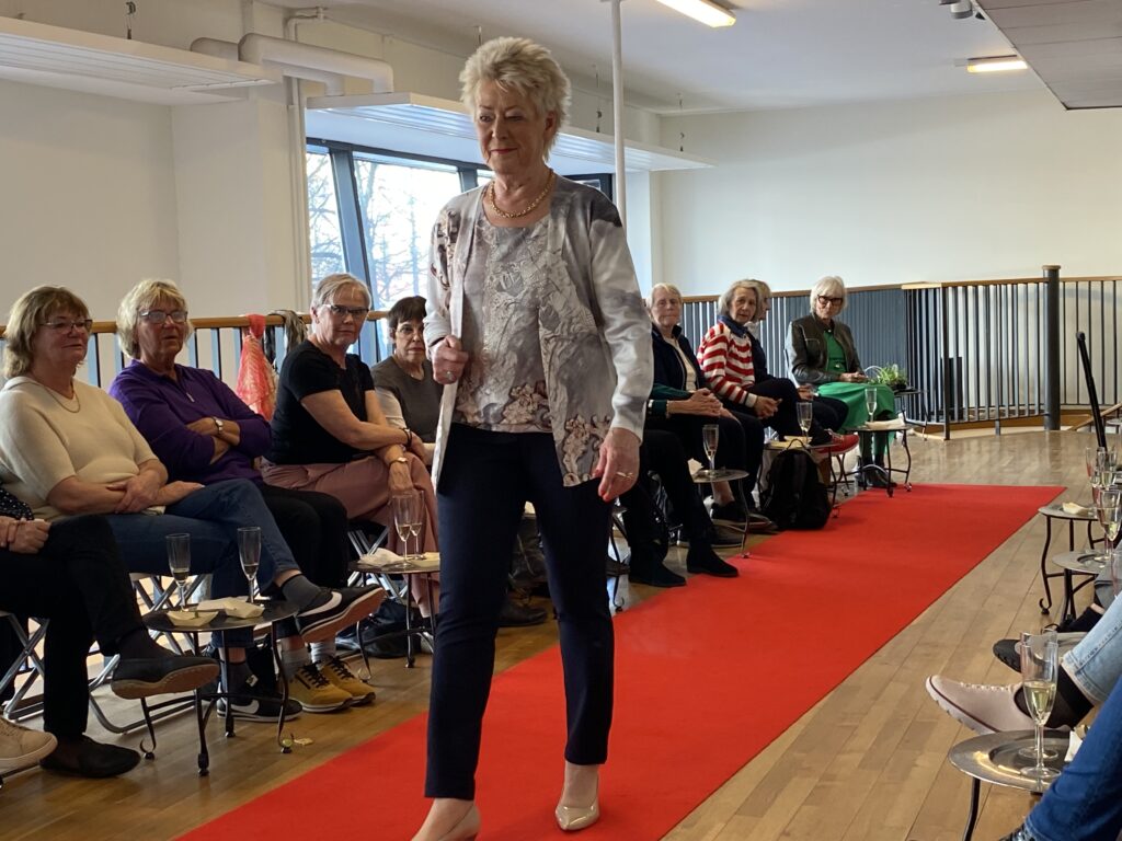Syrenlila, aprikos, rosa, ljusblått, kaki och vitt – det märktes att vi går mot vår och sommar. Och det kunde vi också känna i luften utanför. I år serverades vi munsbitar i fina tunna spånkorgar till gott bubbel under tiden som våra mannekänger visade upp den ena läckra kreationen efter den andra. Man skulle haft lott nr 2 idag – då hade man vunnit en stor blåmönstrad sjal.