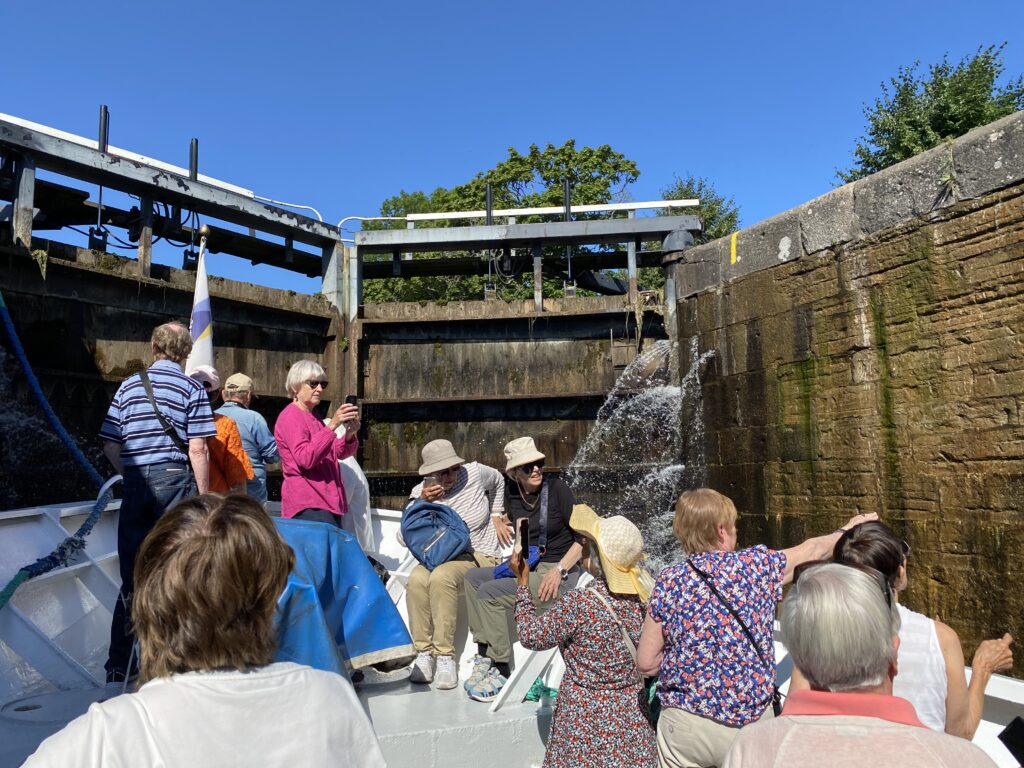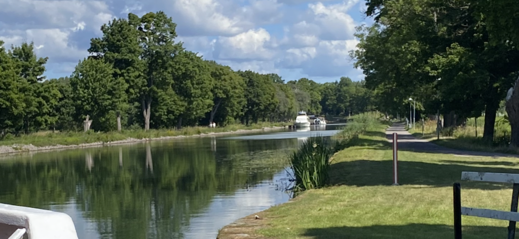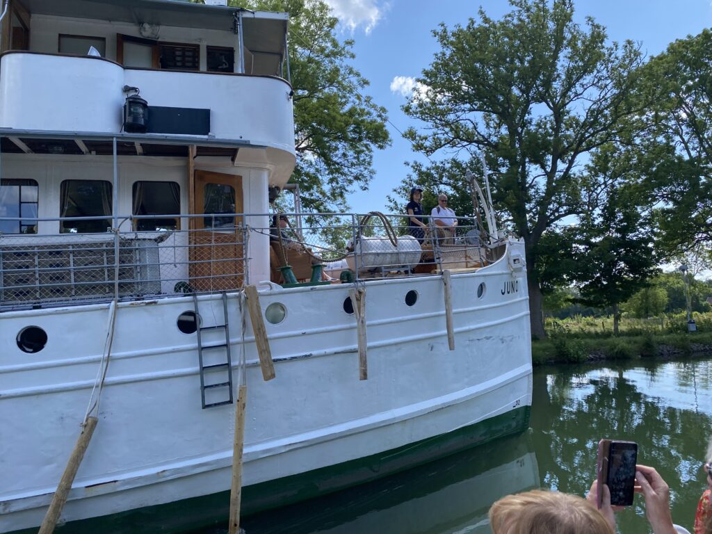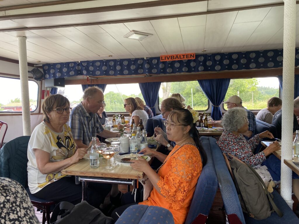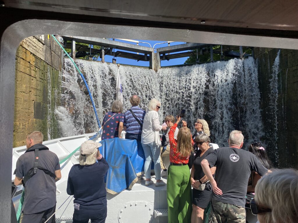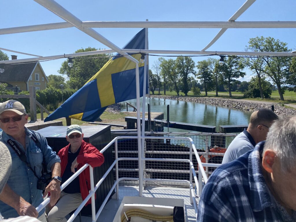 Minnet av Götakanalresan 8 juli 2023 kommer att finnas kvar länge – solen, värmen, svensk sommar i det vackra platta landskapet som sakta rullar framför dina ögon, cyklister längs kanalen som fotar vår båt …och 22 Aktiva Seniorer som sällskap.