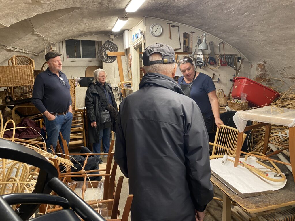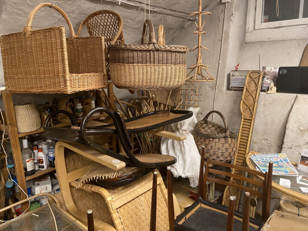 Sen vidare i regnet till en oansenlig trädörr med brant trappa ner i den anrika källaren till korgmakare Larsson. Hon var tredje generationen i firman. Så mycket korgtillverkning hade hon inte. Det mesta arbetet var flätade sitsar och rotting till stolar och stolsryggar bl a till Josef Franks stolar.