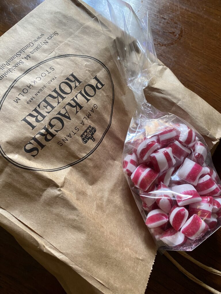 En härlig doft av pepparmint möter oss i dörren. Stora bakbänkar och någon maskin (av cykeldelar) får hjälpa till att få till att skapa polkagrisarna. Idag finns många fler smaker än bara pepparmint. Rabarber var senaste favoriten. Hela butiken var fylld av hyllor med godsaker.